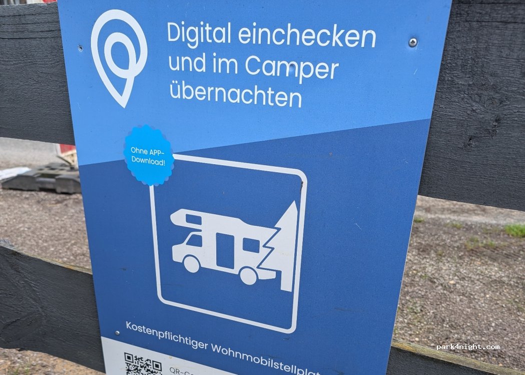 A gauche et devant la barrière du camping se trouvent 3 à 4 places de parking pour camping-cars/camping-cars. L'enregistrement s'effectue via le code QR et le départ à parc4night.