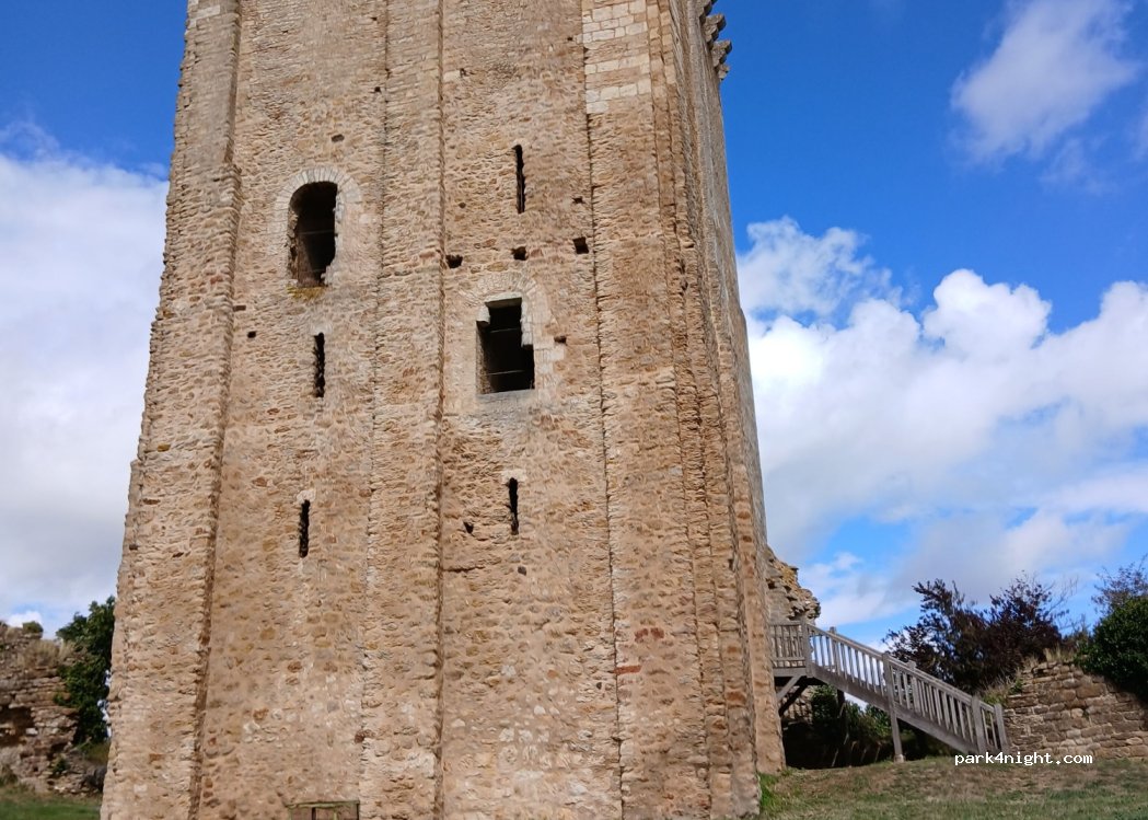 Kleiner Schotterparkplatz am Fuße eines mittelalterlichen Bergfrieds. Ideal für einen Kurzurlaub oder sogar eine Nacht. Kein Verbot. Sehr ruhig. 300 m vom Dorf entfernt.