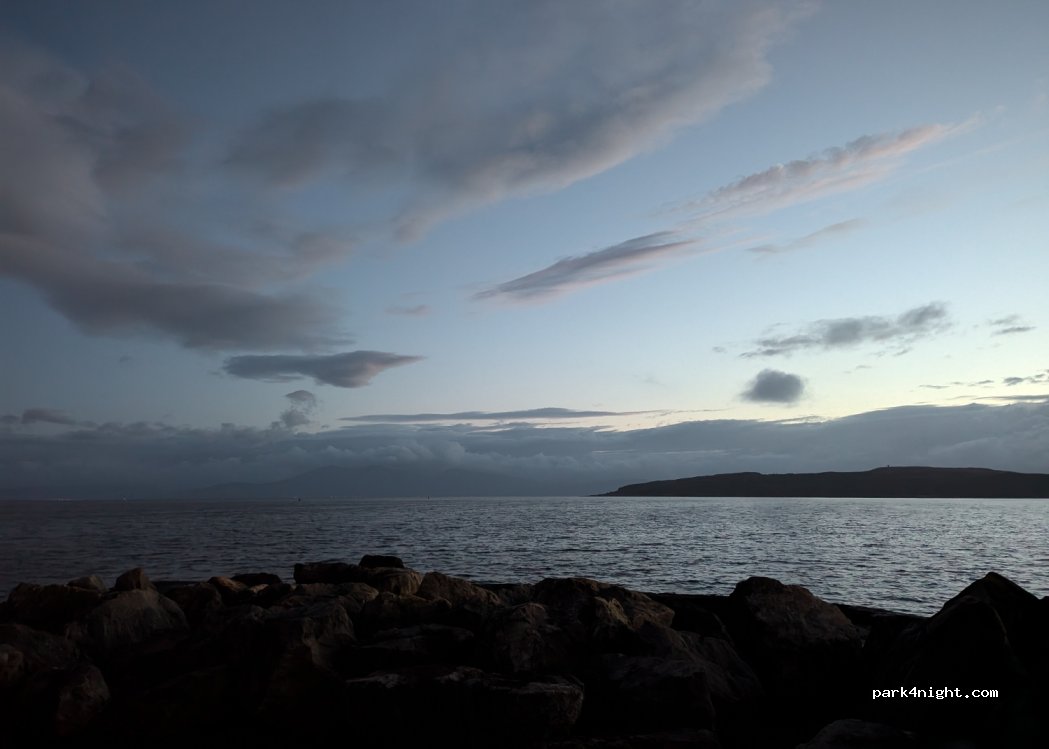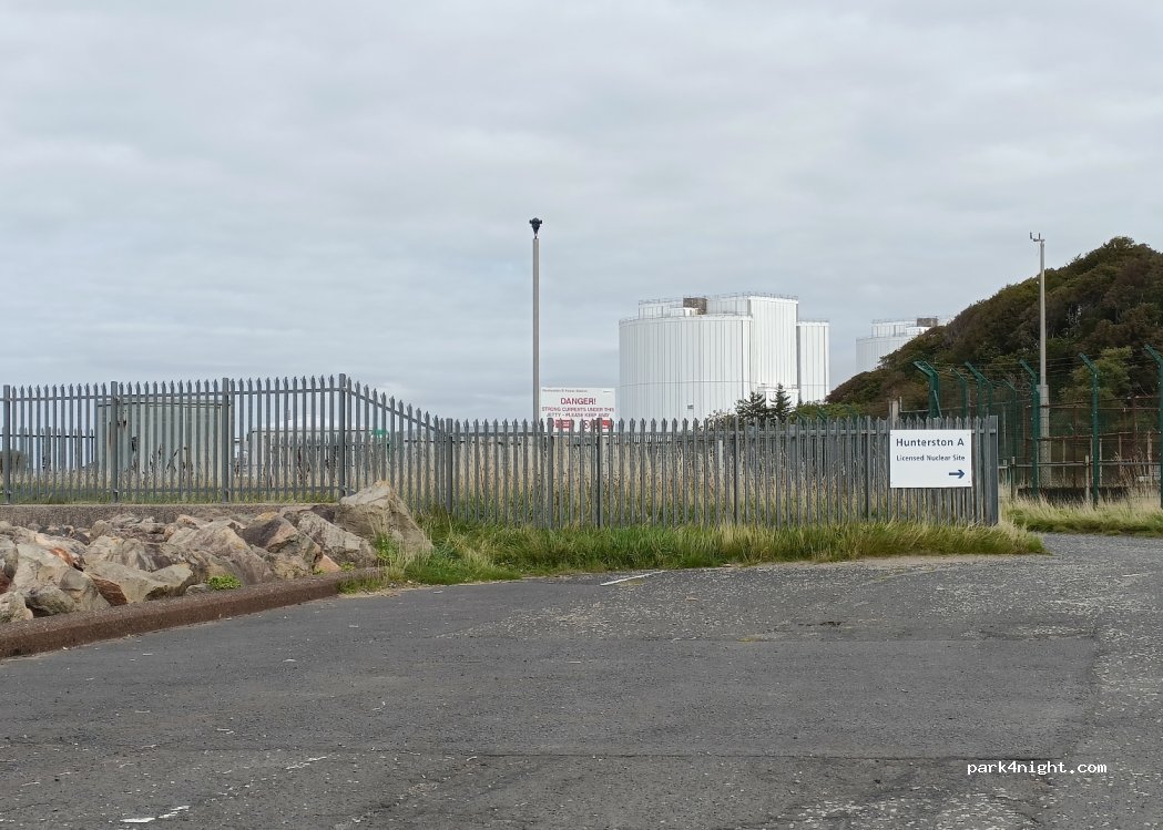 Great spot with beautiful views of Arran! We were hesitant with it being near a power plant, but it turned out to be a lovely spot in a really level car park with a trail near by. There were a few other campers there and some locals going in and out to walk their dogs, but not too much traffic. Follow the road to the very end!