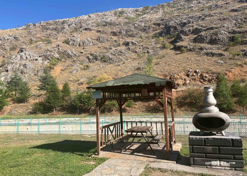 Stellplatz für Wohnmobile neben einem großen Park mit Tischen, Grill und kleinem Laden in der Nähe. Wasserstelle 600 Meter entfernt