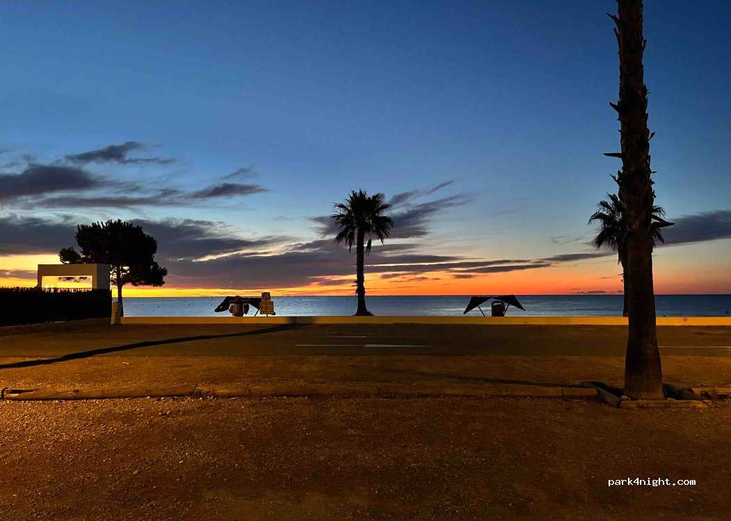 Bezahltes Parken für den Tag vom 15.06. bis 15.09. von 9:00 bis 20:00 Uhr. Wir haben eine ruhige Nacht verbracht. Sehr schöne Strandrestaurants umgeben uns. Die Höhe ist auf Transporter von 1,95 m begrenzt. Ein Kiesstrand und ein sehr schöner Sonnenaufgang.