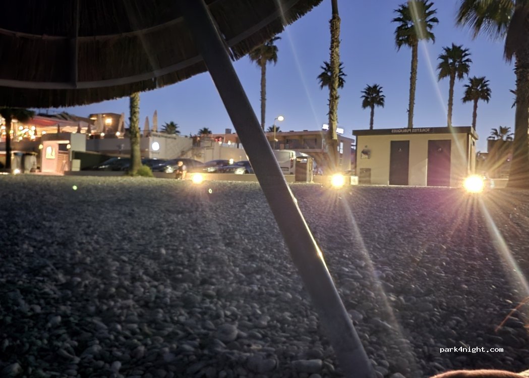 en ville, au bord de la plage payant de 9h à 20h. barre d entrée à 1,90 , nous sommes passés aisément avec le t4. pour la sortie, il y a une barrière fermée de 1h à 6h donc pas de souci pour sortir. arrivés à 19h, quasi plein, mais tout le monde s'en va à la nuit tombée. nuit très calme. la police est très présente mais ras. toilettes avec lavabo propres. douche de plage plus loin. restos
