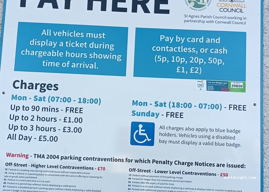 ST Agnes is a very tranquil little place. With great bays, hiking opportunities, shopping opportunities, restaurants and bars, you get the impression that it is a really well-functioning small community. The car park is at the entrance to the town, the first 90 minutes are free, after that the parking fee is very moderate. From 6 p.m. to 7 a.m., Monday to Saturday, there is no parking fee, and on Sundays it is completely free. It does not explicitly say that overnight stays are prohibited here, such as overnight stays down in the bay... there are only a few flat parking spaces.