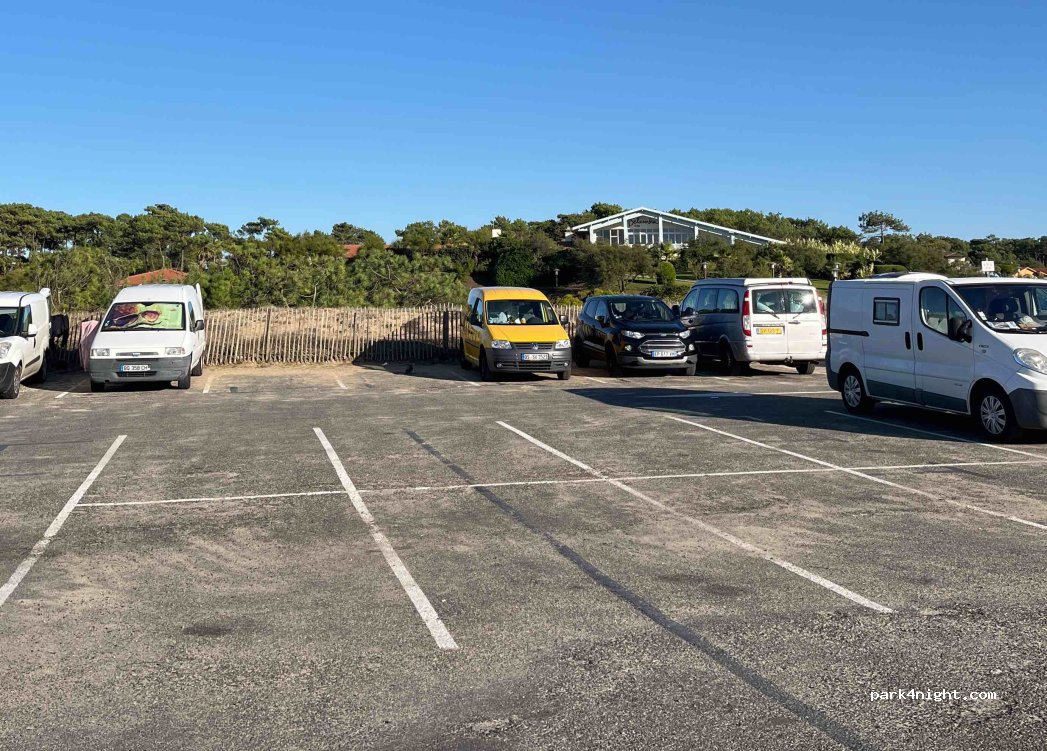 Bon spot avec 2 toilettes (ça fait peu, ça sent l'urine sur le parking), 3 douches et eau potable. Le parking se remplit vite, les places sont étroites. Plage a 2min beau sunset, bar/restau, possibilité de cours/loc de surf/velo chez loulou ou au Belambra (- cher). Nous avons trouvé que c'était calme de 23h a 7h30. Barrière à 1.90, nous sommes passés avec notre trafic + lanterneau.
