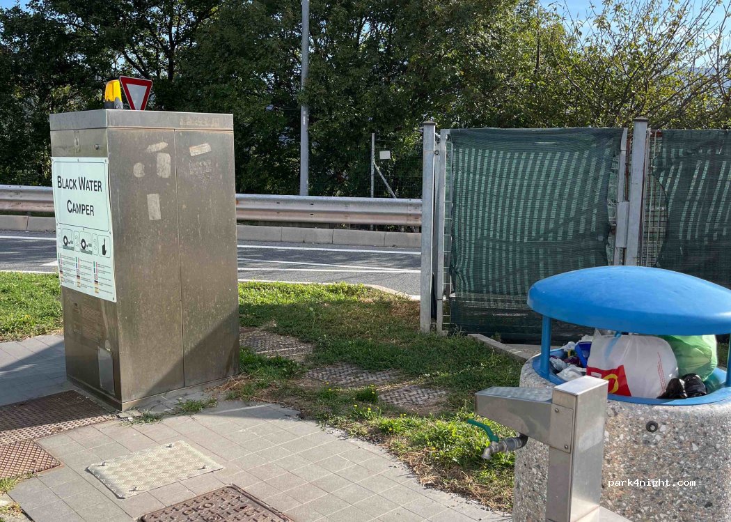 Area di sosta con distributore di benzina e smaltimento acque reflue (grigia e nera) e carico acqua