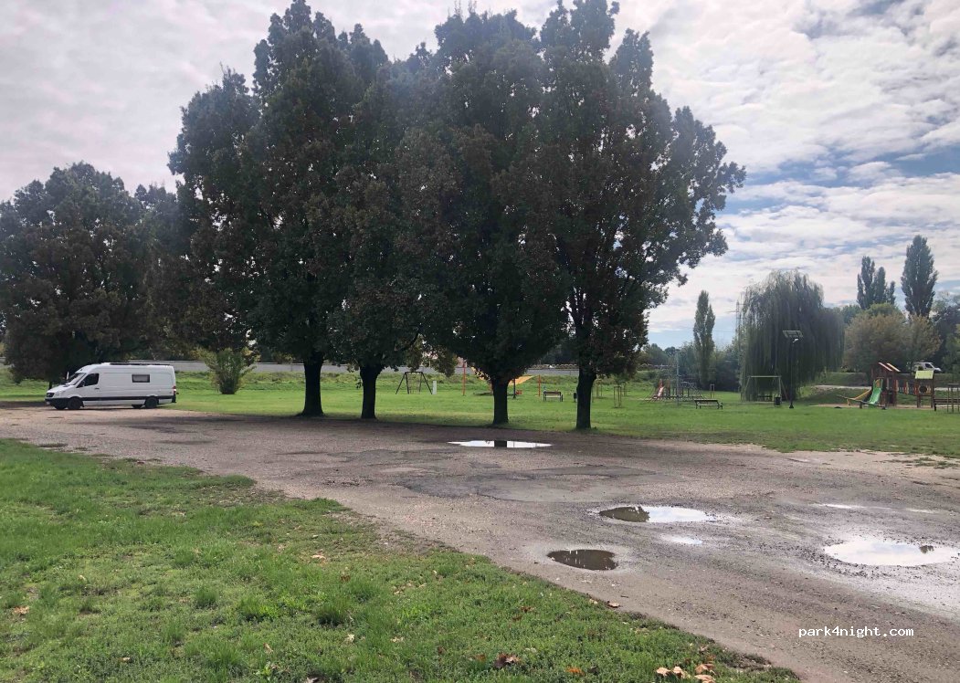 Tarmac parking lot on the edge of a playground, a large park and a zoo accessible by a bridge. Flat, not far from a busy road but in the evening it is very quiet (and during the day it is also ok). 100m from a Lidl. We stayed there for several days during bad weather, the police came by and said hello.