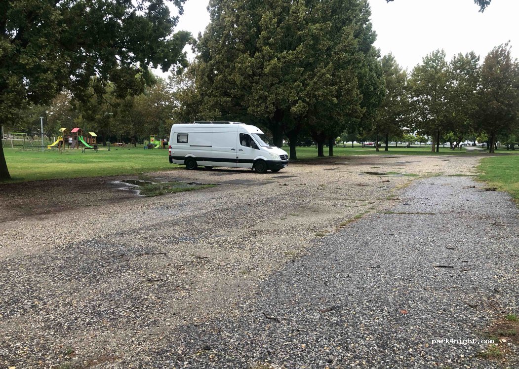 Aparcamiento asfaltado al borde de un parque infantil, un gran parque y un zoológico accesible por un puente. Llano, no lejos de una calle muy transitada, pero por la noche es muy tranquilo (y durante el día también está bien). A 100 metros de un Lidl. Nos quedamos allí varios días cuando hacía mal tiempo, vino la policía y nos saludó.