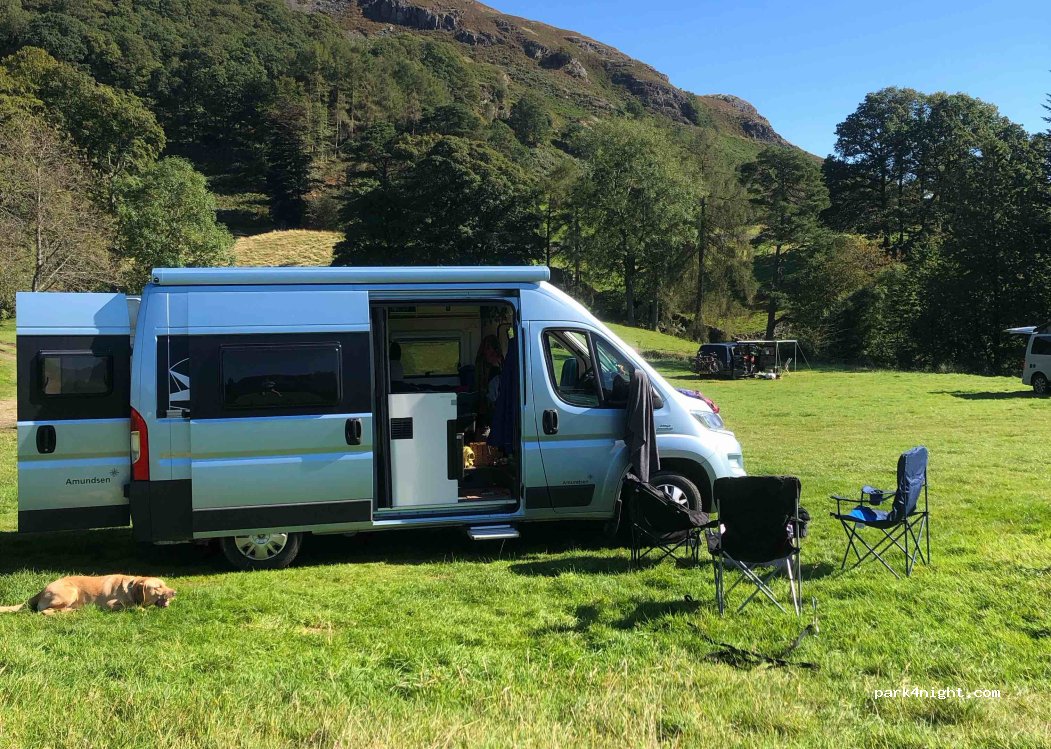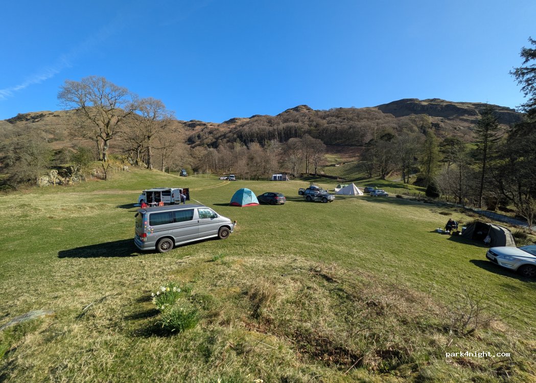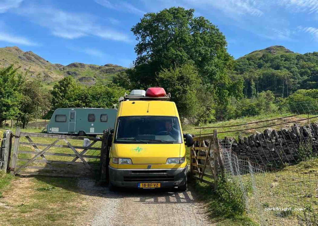 This is a lovely small site. £9.00 per person per night. Two clean toilets adjoining the rear of the farmhouse. An outside belfast sink in the yard. Campfires and BBQ's allowed. They must be extinguished by 11pm. A 15 stroll down the lane to the Talbot Bar in Skelwith Bridge. The gate is very narrow. I needed to pull in the door mirrors on our Renault Trafic. larger vehicles would struggle.