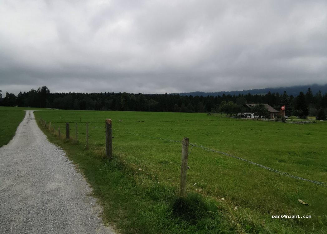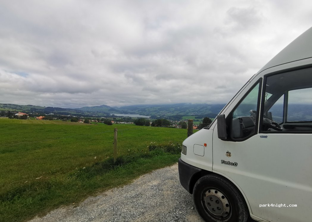 Petit parking face à la vue et au lac. Une poubelle et une table de picnic sont à côté dans le Bosquet. Ce n'est pas très plat mais ça reste correct. Place pour 2 van pas plus. Champs, vaches et sons du clocher autour.