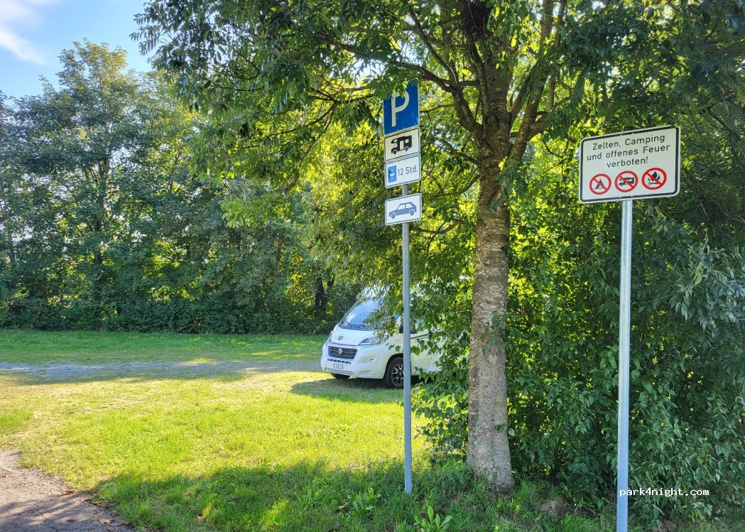 Beschilderung ist etwas schwierig zu verstehen. Alle Schilder sind für Pkws. Nur wenn man von hinten ( außerhalb des Parkplatzes) zwischen die Büsche fährt sieht man, dass 1 Streifen für Wohnis gedacht ist. Davon abgesehen sehr ruhig. Wir waren ganz alleine hier. Danke an die Gemeinde. Vielleicht 1 Schild mehr zur Erklärung.