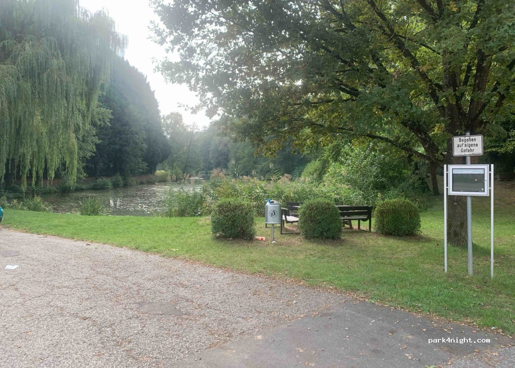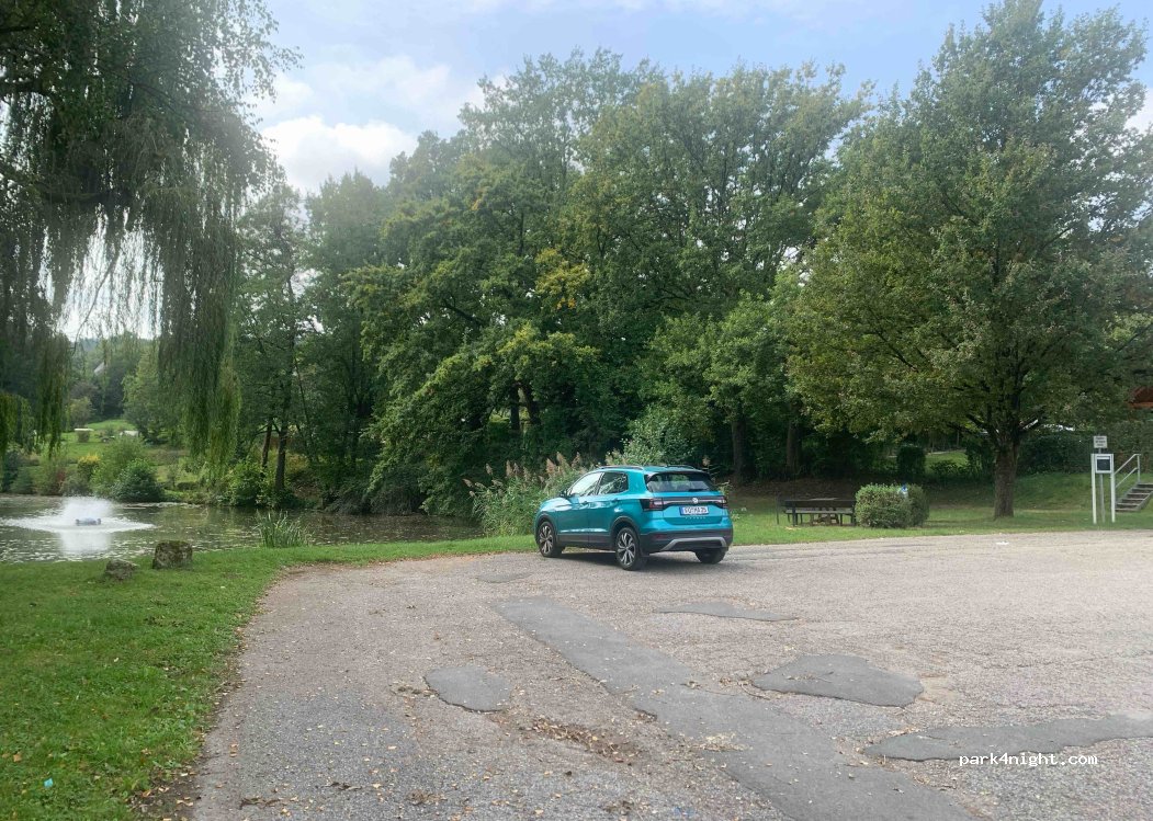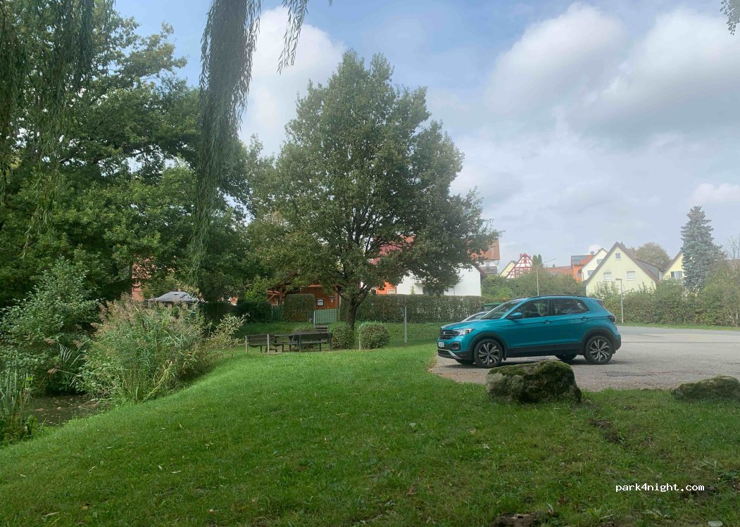 Parking near the 1. FC Burk sports center. Approximately 8 parking spaces overlooking a pond and a seating area with a wooden table. Apart from a trash can, there are no other supplies, but it is well located for a walk along the canal and towards Forchheim city center. Next to the sports center there is also a good Italian restaurant where you can enjoy delicious dishes.
