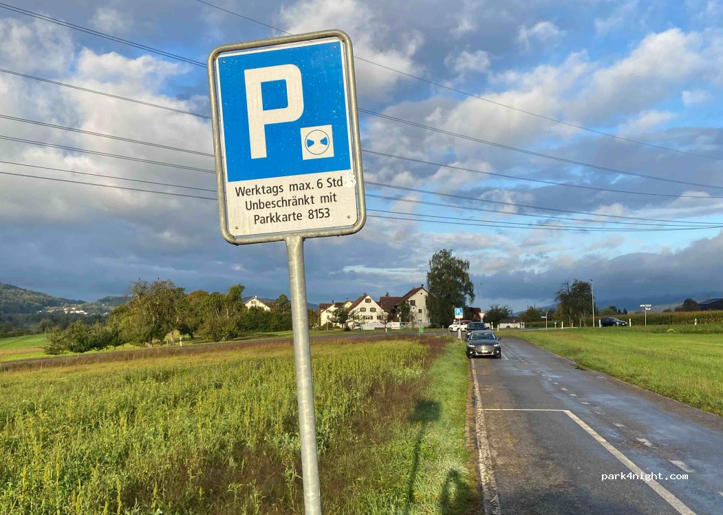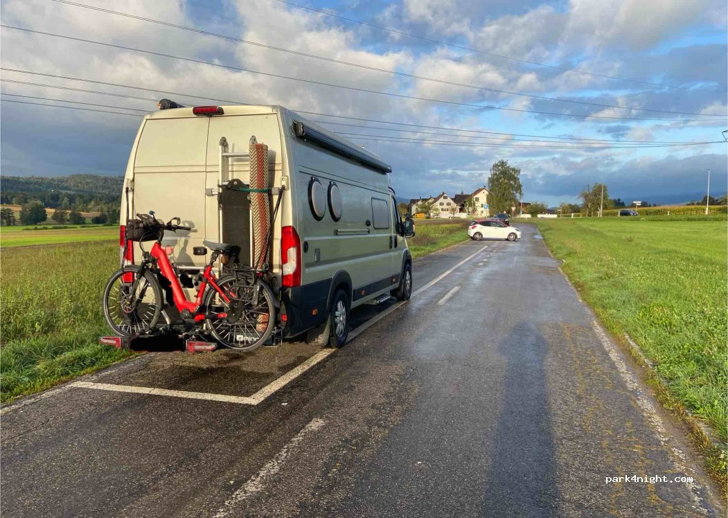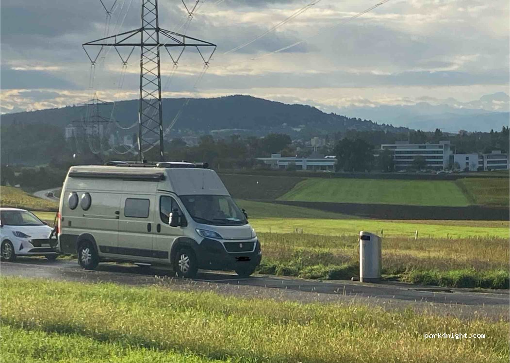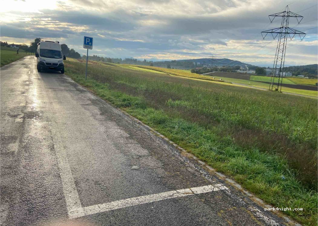 Zwei grosse Parkfelder für jeweils 4 Fahrzeuge geeignet. Am Anfang einer Sackgasse, relativ schmale Strasse, ein Wenden ist mit einigen Manövern möglich. Die Strasse oben wie unten sind in der Nacht sehr wenig befahren daher ruhig. Platz wird von Spaziergängern benutzt. Mit täglichen Polizeikontrollen muss gerechnet werden. Keinerlei Dienstleistungen.