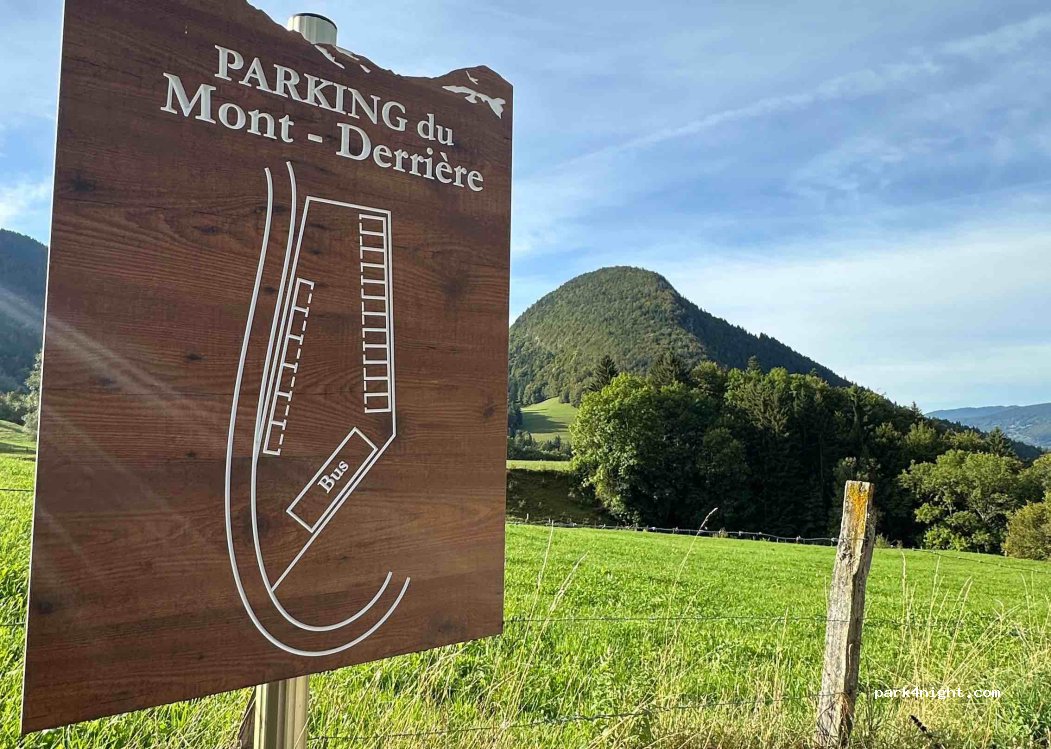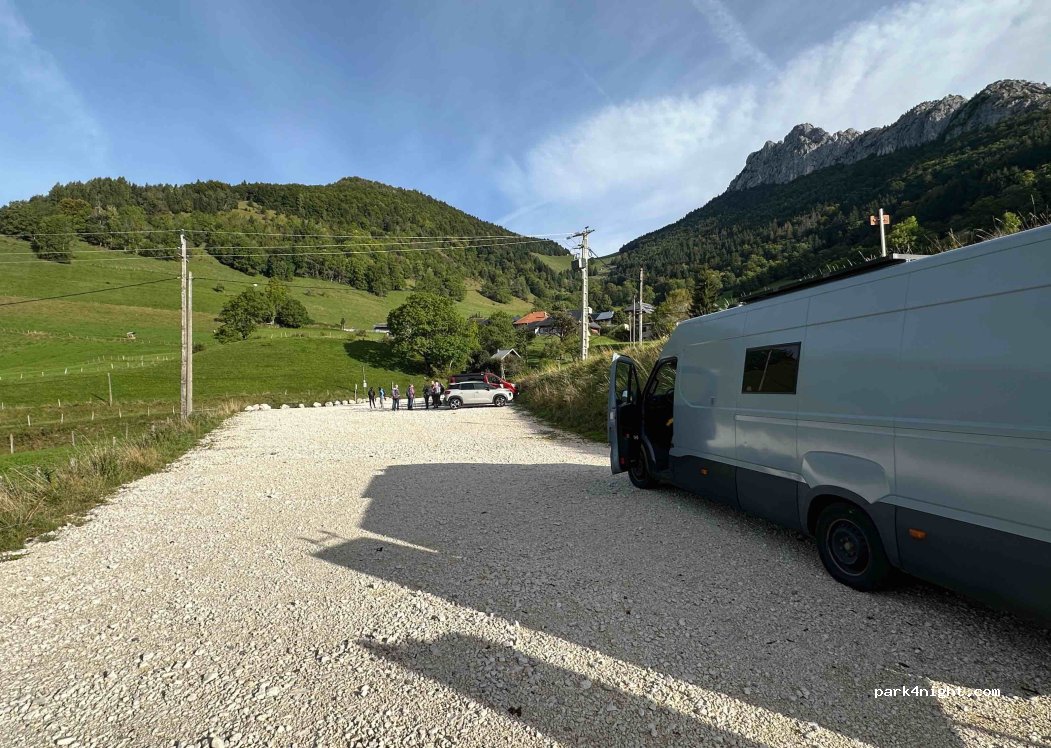 Un grand parking en gravier, presque plat. Niché entre collines verdoyantes et fermes. Secteur calme, aucun panneau interdisant le camping de nuit. Poubelles à disposition. Départ de sentiers de randonnée, escalade à proximité.