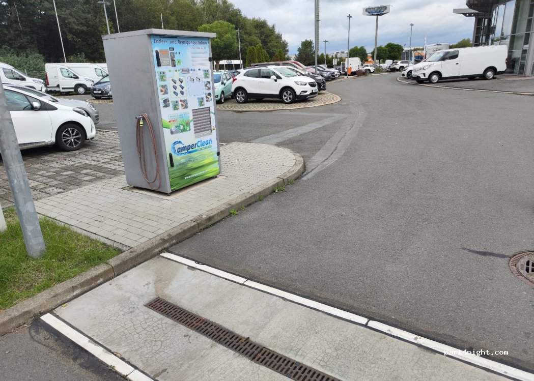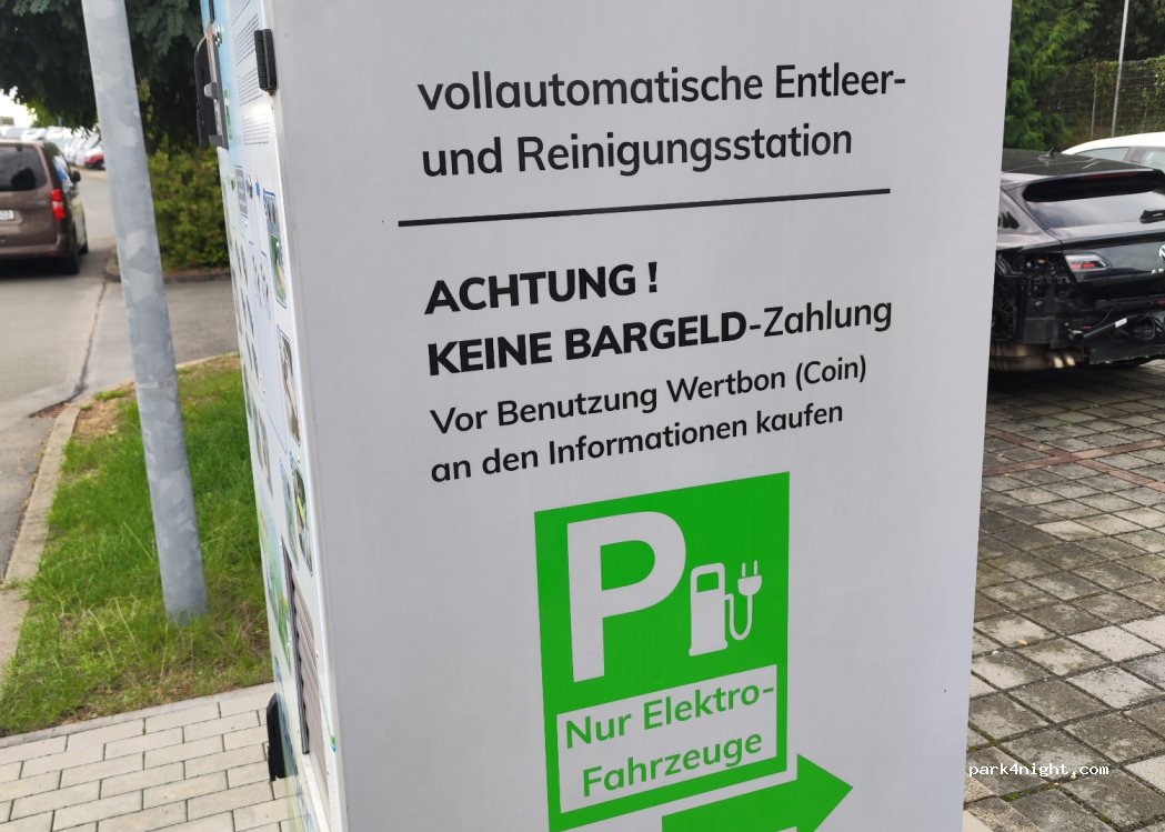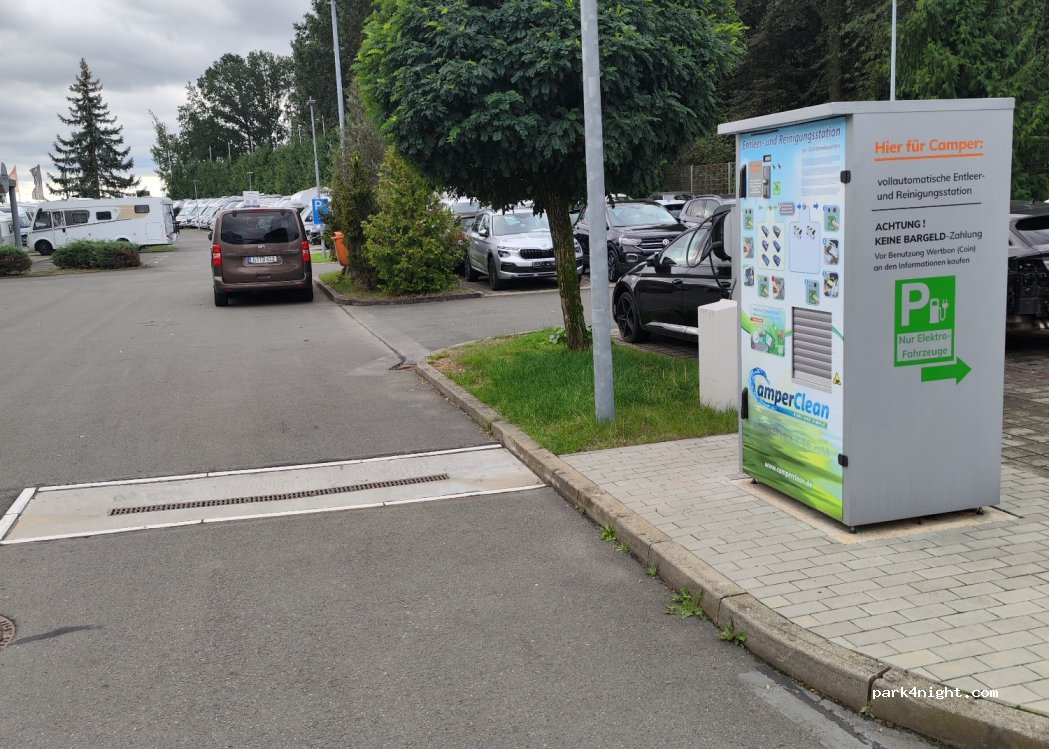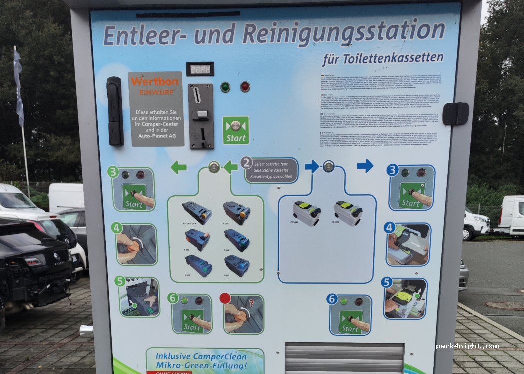 Bei Auto-Planet. Moderner Kassettenautomat. Wertmünzen an der Camper Information. 3 Euro pro Entleerung.