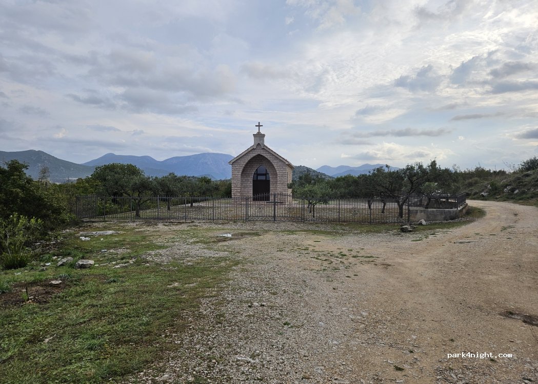 Schotterparkplatz bei einer Kapelle. Superschön, ruhig und von der Straße aus sichtgeschützt. Parken kann man beidseitig der Kapelle. Auf der angrenzenden Straße ist Camping verboten, daher kann es durchaus sein, dass das Parken bei der Kapelle während der Saison nicht geduldet wird. Sehr schön.