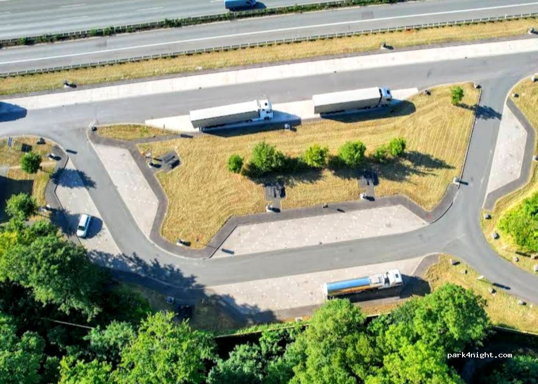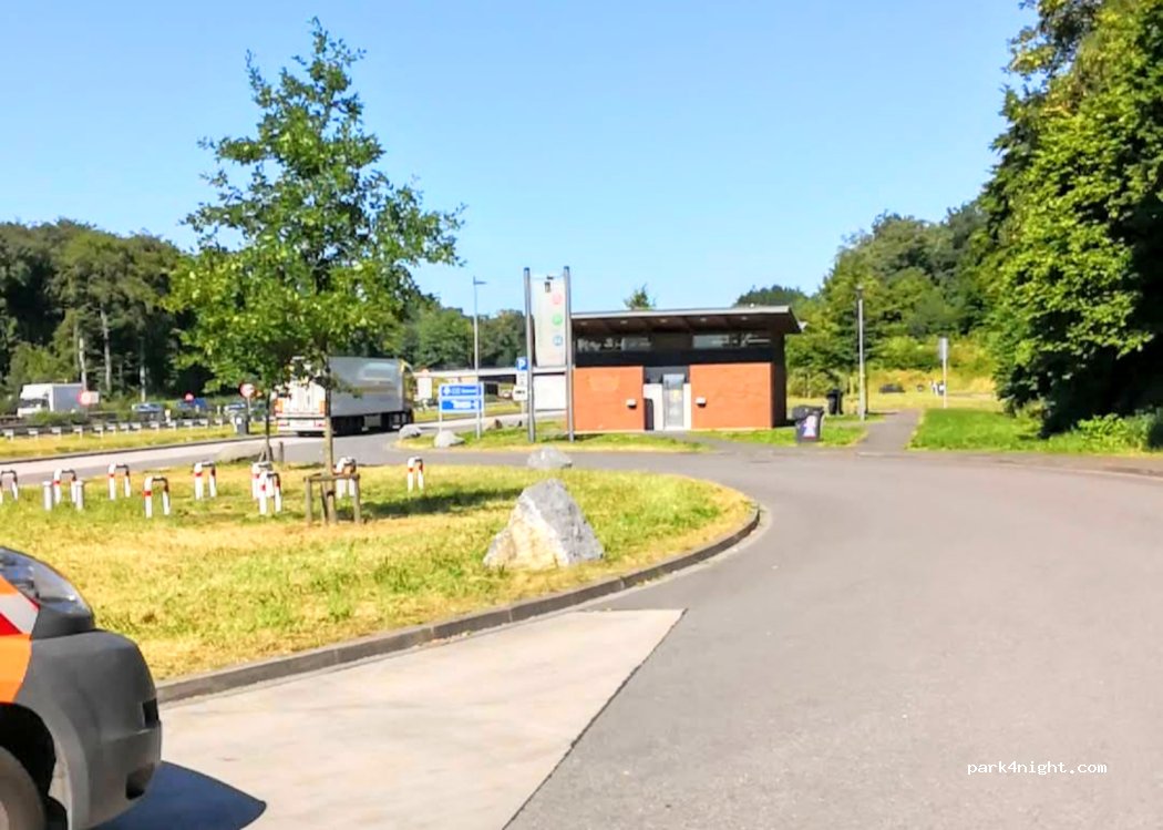 Rest area along the highway 2 in Recklinghausen municipality. In the rest area there are trucks and cars/vans/campers paved parking spaces. There aren't any prohibitions signs about overnight stays. Toilets are available.