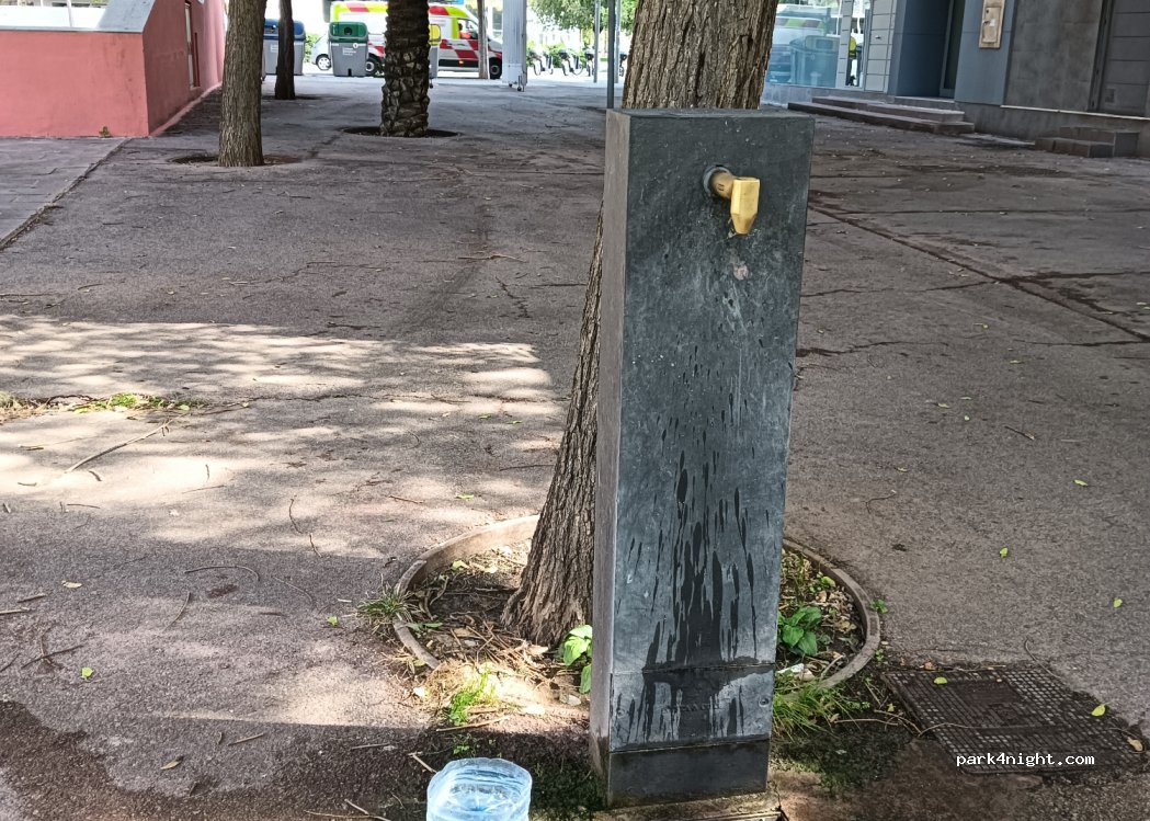 Water fountain inside a park. Closed at night. There are few parking spaces nearby and it is a green area (pay per hour)