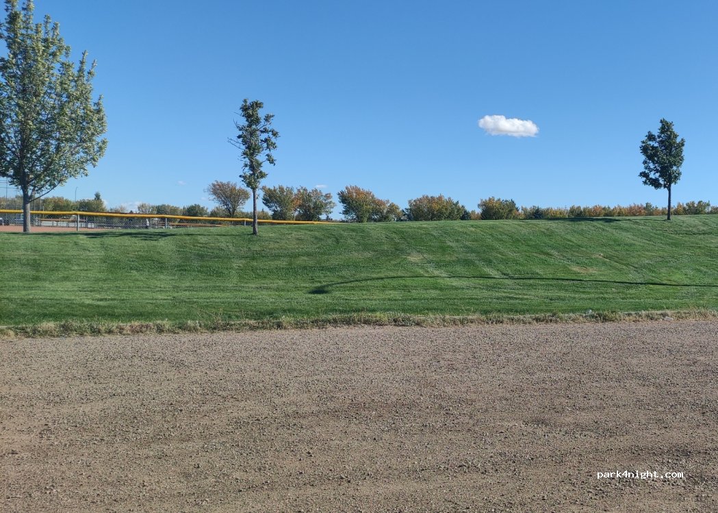Parking en gravier, en face du complexe sportif (suffisamment en retrait pour être au calme) où nous avons pu prendre une douche chaude ! Accès à des toilettes publiques à côté des stades de baseball.