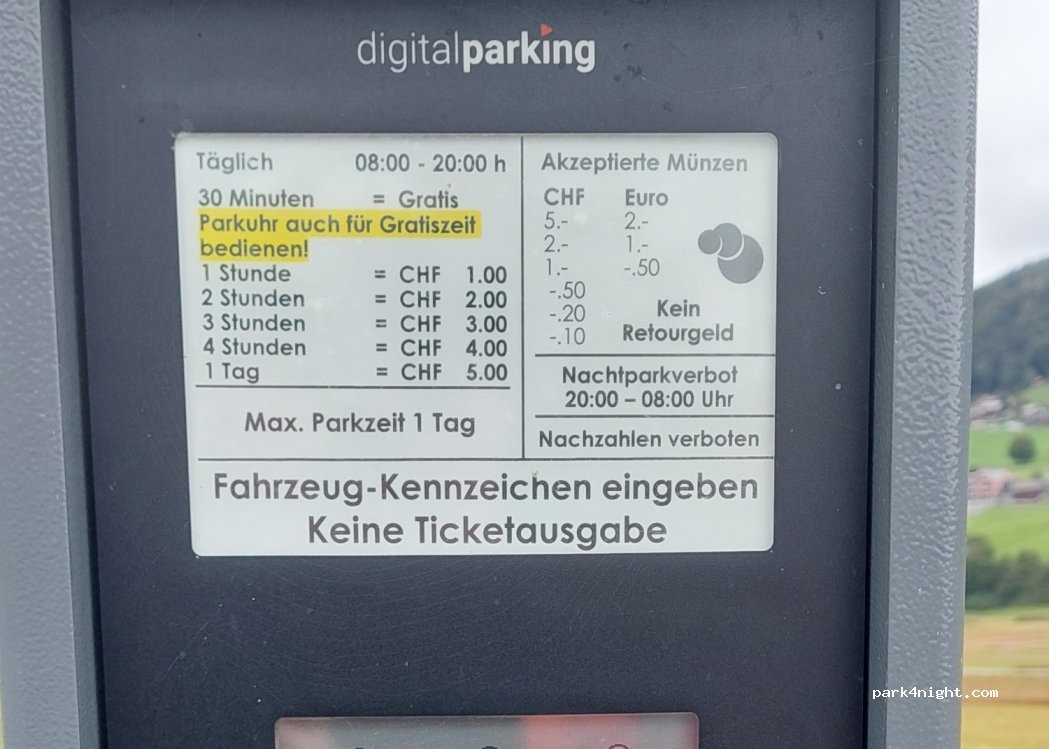 Day parking without service. No parking at night, but plenty of space, very sloping. Ski jumps nearby, could be tight during events.