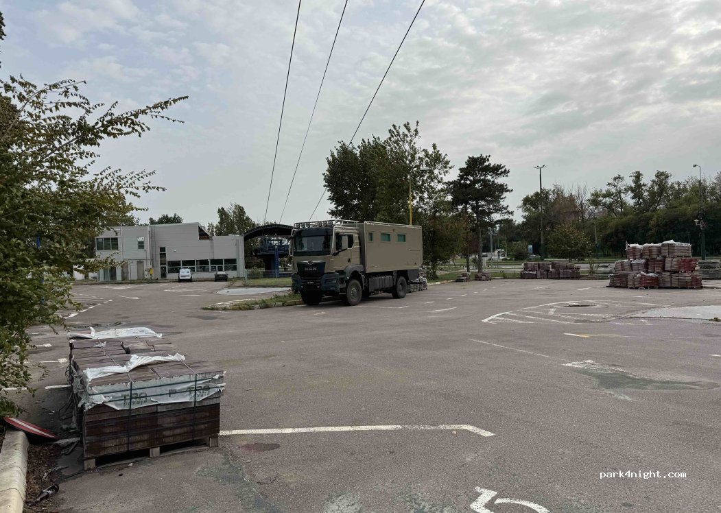 Large parking lot on the outskirts of town. No prohibition signs. Free. We spent a quiet night. Restaurants very close by. Also suitable for large vehicles.