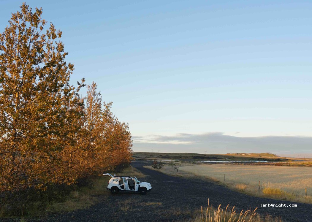 Parkplatz neben der Straße hinter einer Baumgruppe. Fluss direkt neben an zum Wasser filtern. Ruhige Nacht gehabt