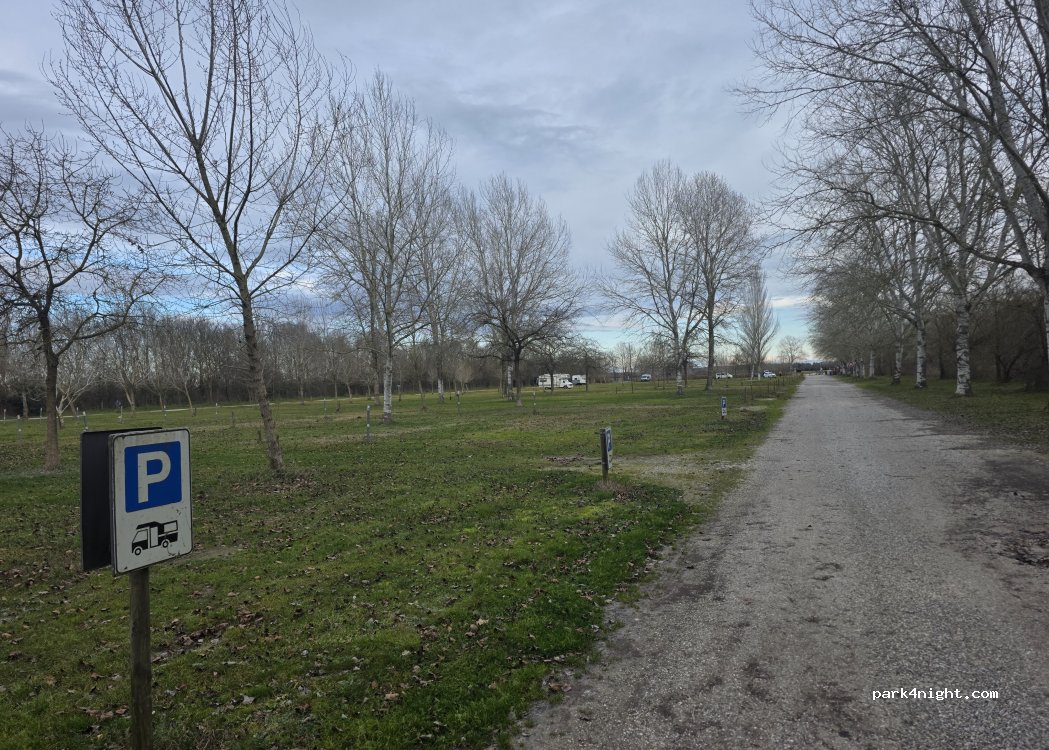 Grande pelouse divisée en emplacements pour voitures et camping-cars, les camping-cars étant installés au milieu. Pas de vidange des eaux grises ni des eaux noires, mais des toilettes et des douches sont disponibles.