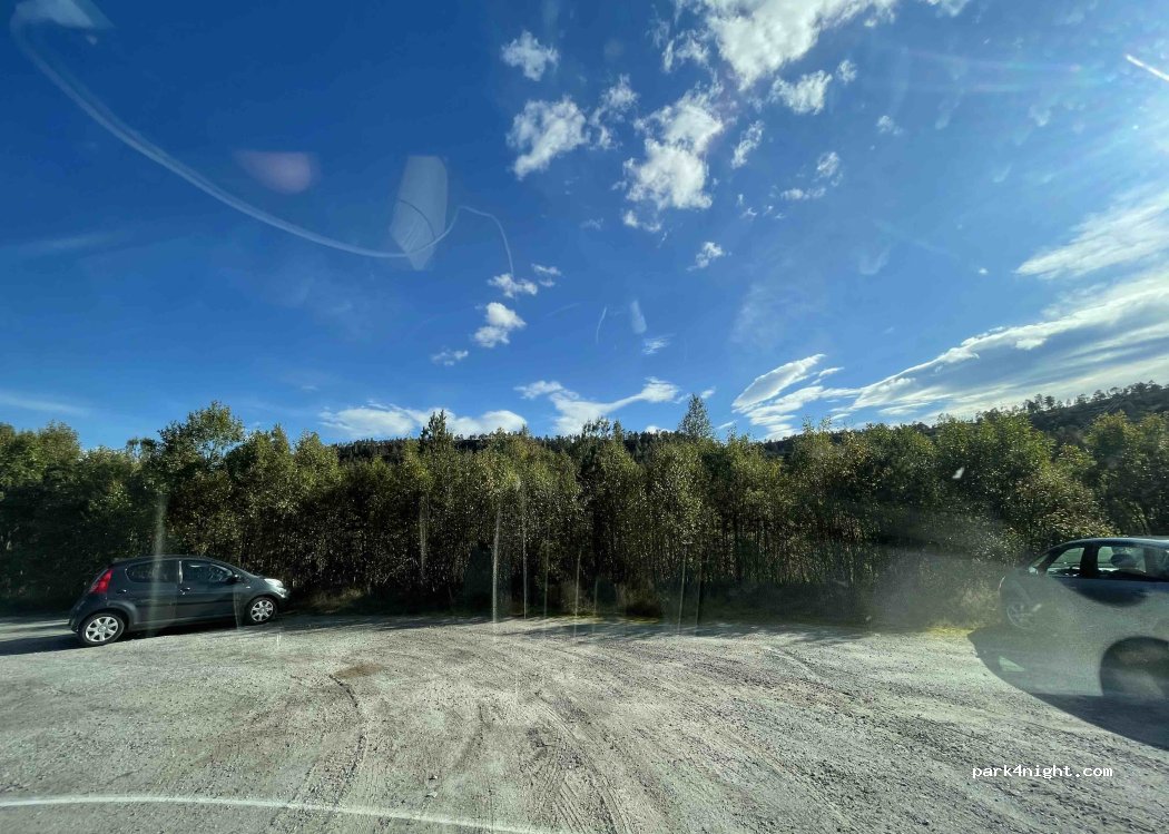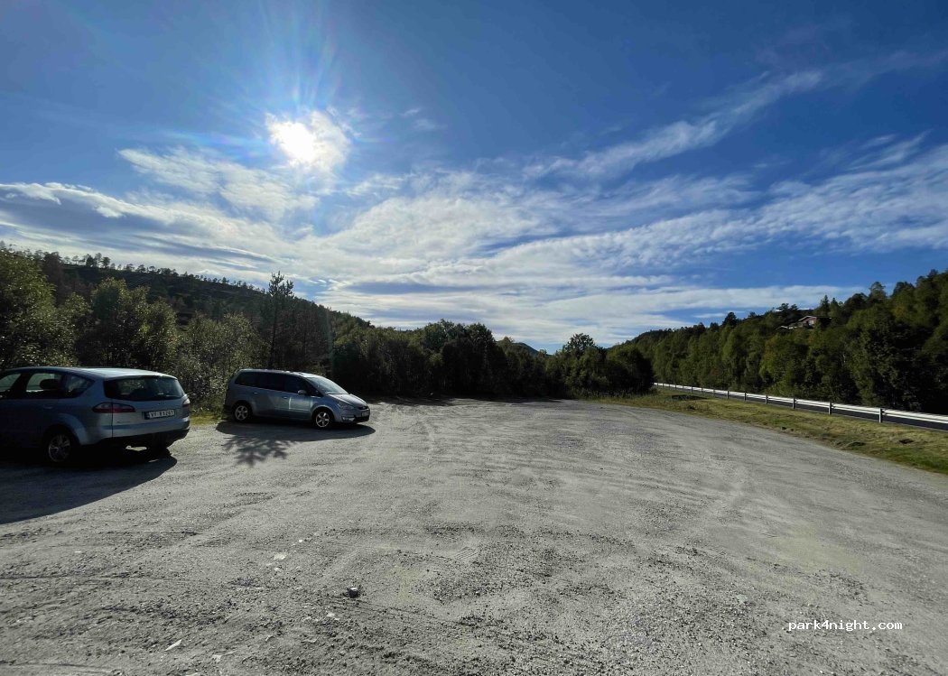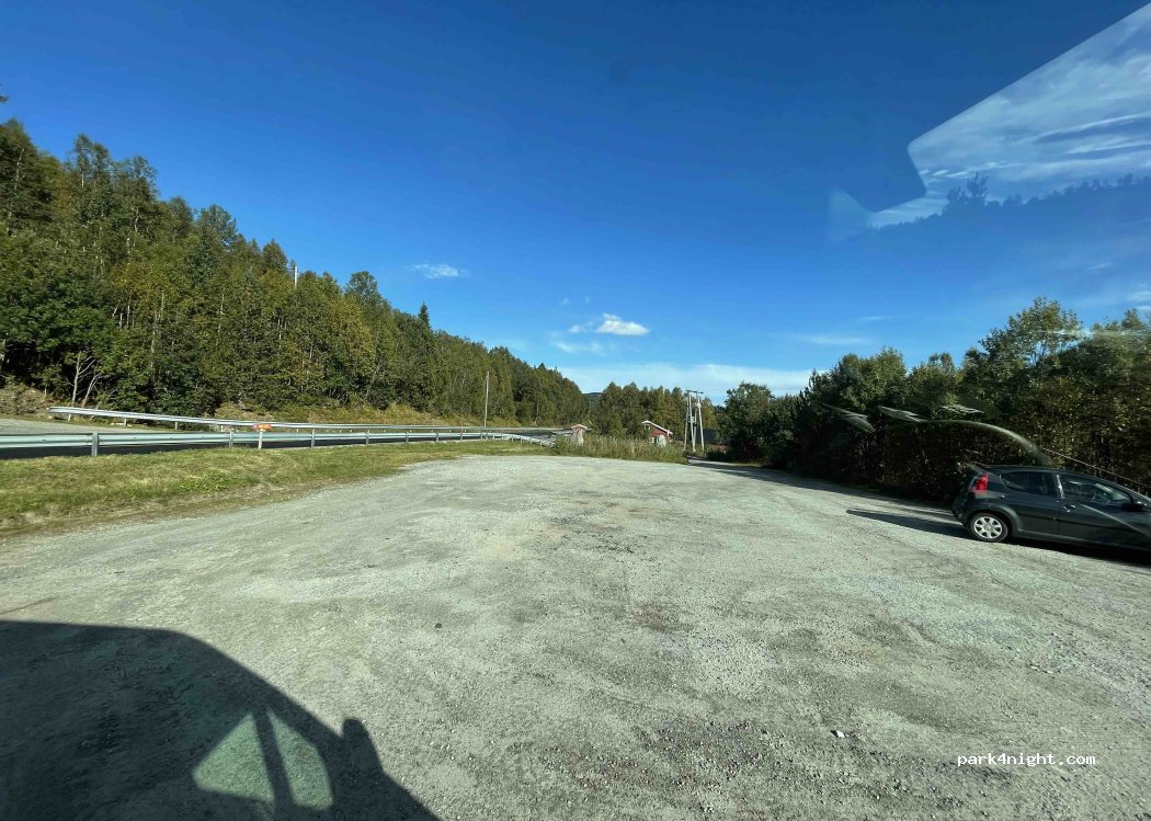Nuit calme samedi soir, pas de circulation. Grand parking en cailloux plat, pratique pour une nuit sur la route de Trondheim.