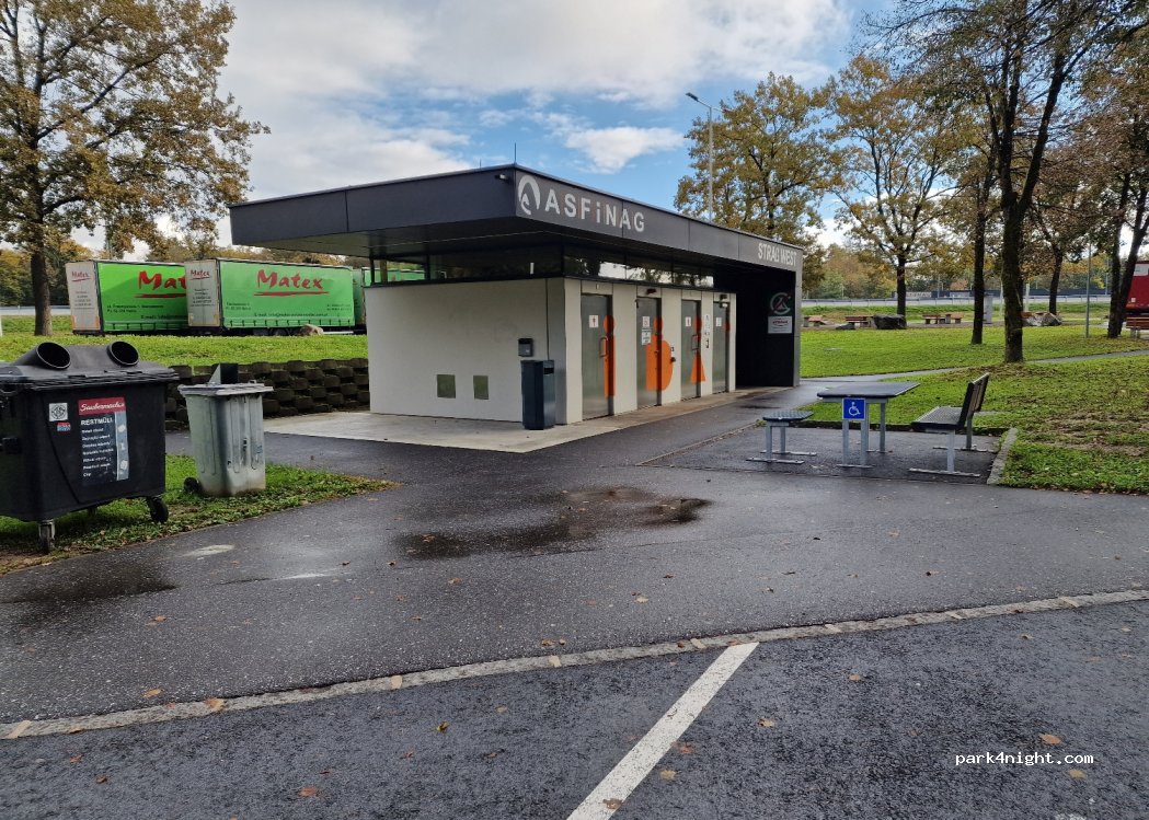 Dobry parking na jedną noc, nie było zbyt głośno. Dostępne toalety, prysznic za 1 €, stoliki (również w cieniu pod drzewami).