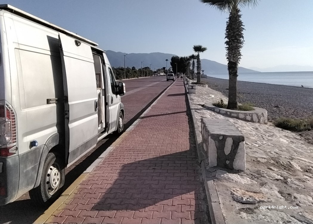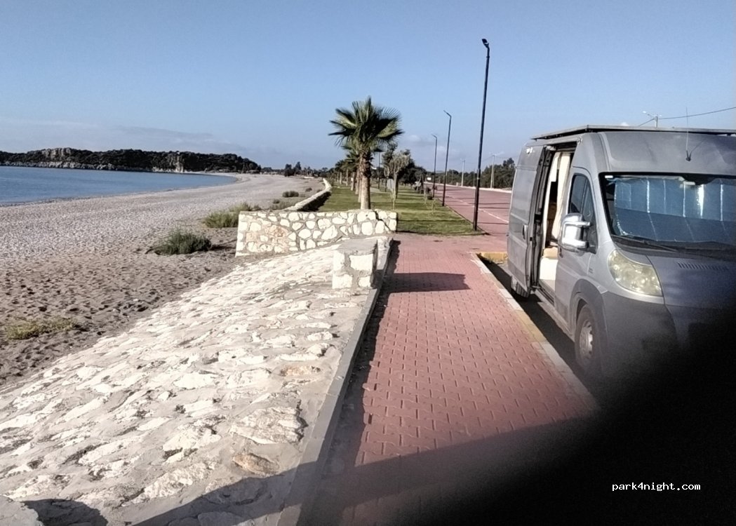 Free parking area by the beach. You can swim in the sea during the day. There is a park where you can take a walk in the evening. There is a Migros 750 meters away.