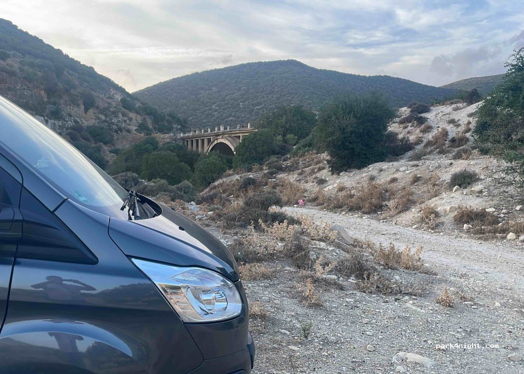 Right next to the old railway bridge you can turn off the P11 and stand on the way to the bridge. The path is only used by goats and shepherds. You can hear the road but no one came by at night. Suitable for one or more nights...