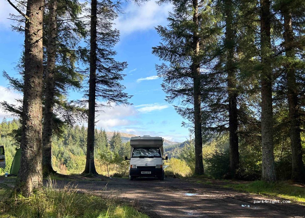 Lovely spot on the Three Lochs Forest Drive. Permit required from Loch Lomond and the Trossachs National Park website-£5. There are 2 motorhome spaces very close together and an area for tent camping so be prepared to share. Trowels provided!!