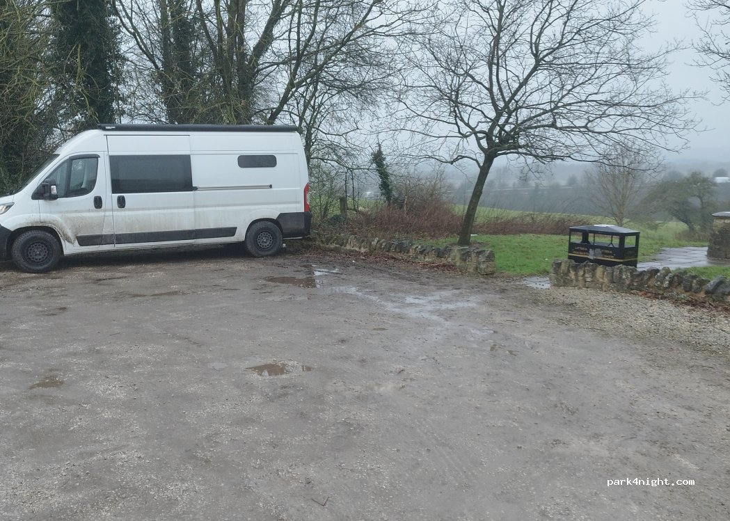 Small parking area as described. No facilities but there is a village pub 100 meters away. Not good for walking dogs but looks like there would be a lovely view on a non cloudy rainy day! A little noise from the M18 but didn't bother us, quite soothing actually.