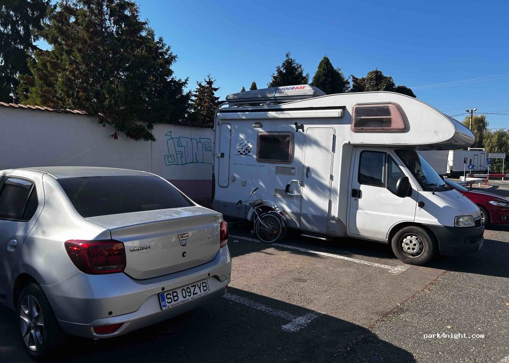 Parking lot near the town and market. We asked a policeman and it is OK to park the camper here. But anything longer than 5.4m is not allowed, otherwise the vehicle would extend too far into the street. The sidewalk must remain clear. Payment only with 10/20 leu bills or by Visa contact (it worked well)