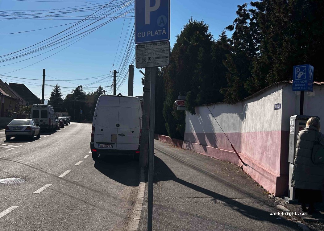 Aparcamiento cerca de la ciudad y del mercado. Preguntamos a un policía y está bien aparcar la autocaravana aquí, pero no se permiten vehículos de más de 5,4 m de longitud, ya que el vehículo se adentraría demasiado en la calle. La acera debe permanecer despejada. El pago solo se realiza con billetes de 10/20 leu o mediante tarjeta Visa (funcionó bien).