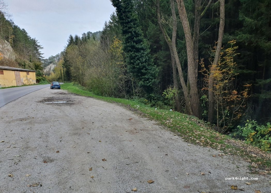 Aparcamiento nivelado de gravilla justo al lado del arroyo de agua cristalina. Por la noche apenas hay tráfico.