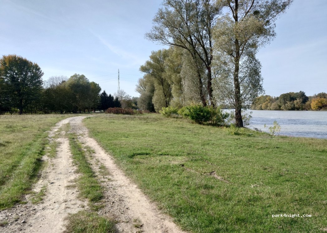 Bonito lugar para estacionar en la orilla del río Drava. Pradera plana junto a un bosque, algunos edificios residenciales cerca. Paramos aquí solo para almorzar, nadie nos molestó, algunos lugareños amables vinieron solo a saludarnos. No vi ninguna señal que prohibiera estacionar o acampar, pero no sé si es legal pasar la noche aquí.