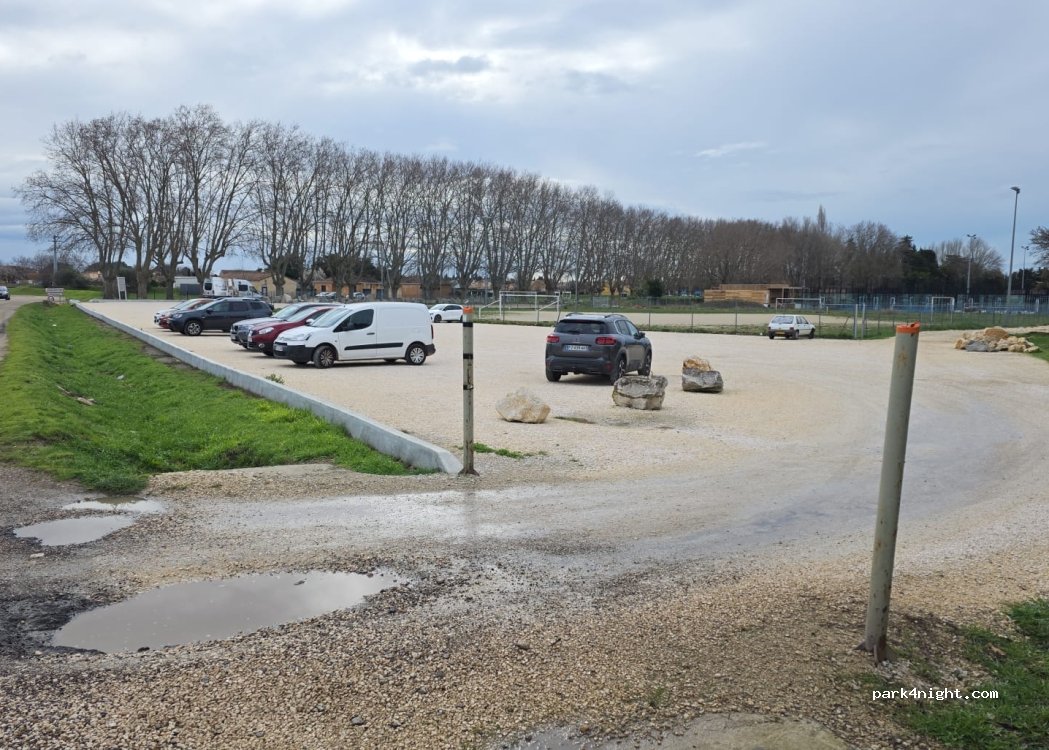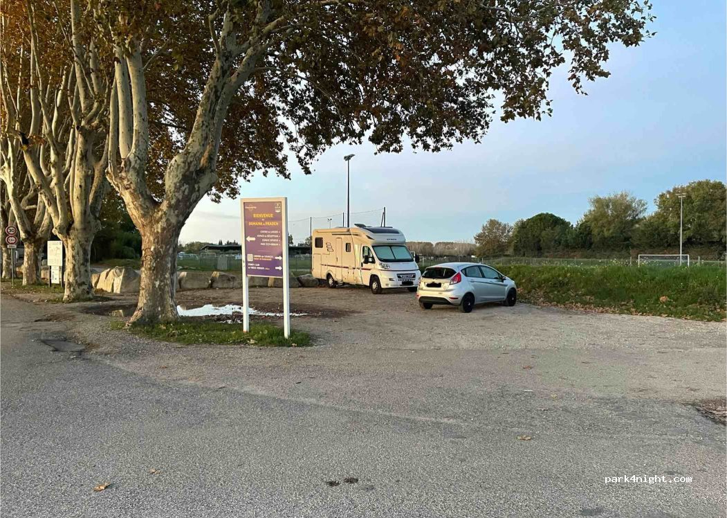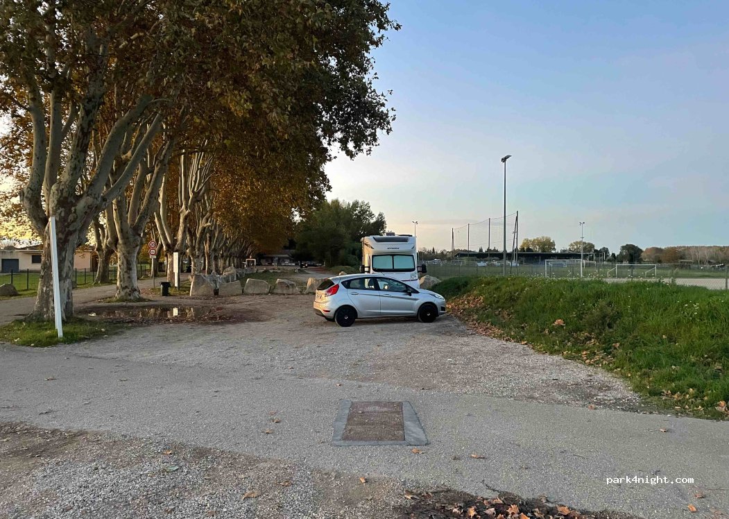 Pequeño aparcamiento para 1-2 casas móviles en las afueras de la ciudad de Marguerittes. El aparcamiento está situado entre el supermercado Intermarche y un campo deportivo y una gasolinera. A unos 2 km de la salida de la autopista. Hay un bote de basura disponible.
