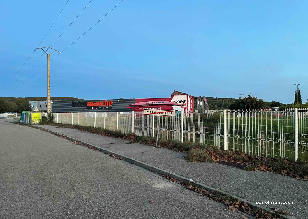 Kleiner Parkplatz für 1-2 Wohnmobile am Rande des Ortes Marguerittes. Parkplatz befindet sich zwischen Supermarkt Intermarche und einem Sportplatz sowie einem Tankautomat. Ca. 2 km von der Autobahnausfahrt. Ein Mülleimer ist vorhanden.