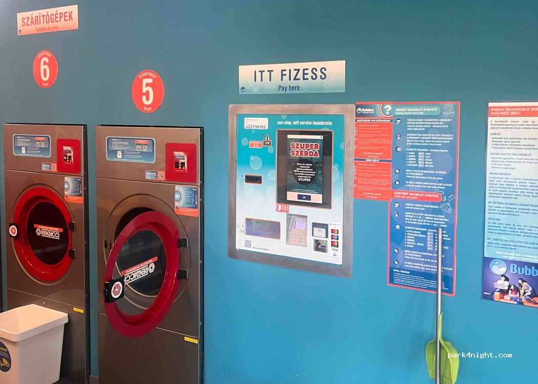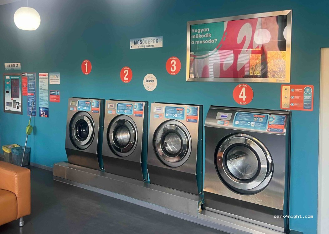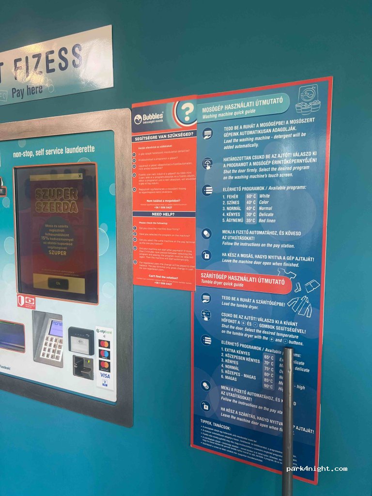 Great launderette with lots of parking for any size camper. Card or cash payment. Easy instructions to follow in English. 5 washing machines and 4 dryers for clothes. As well as pet machines and a coat machine.