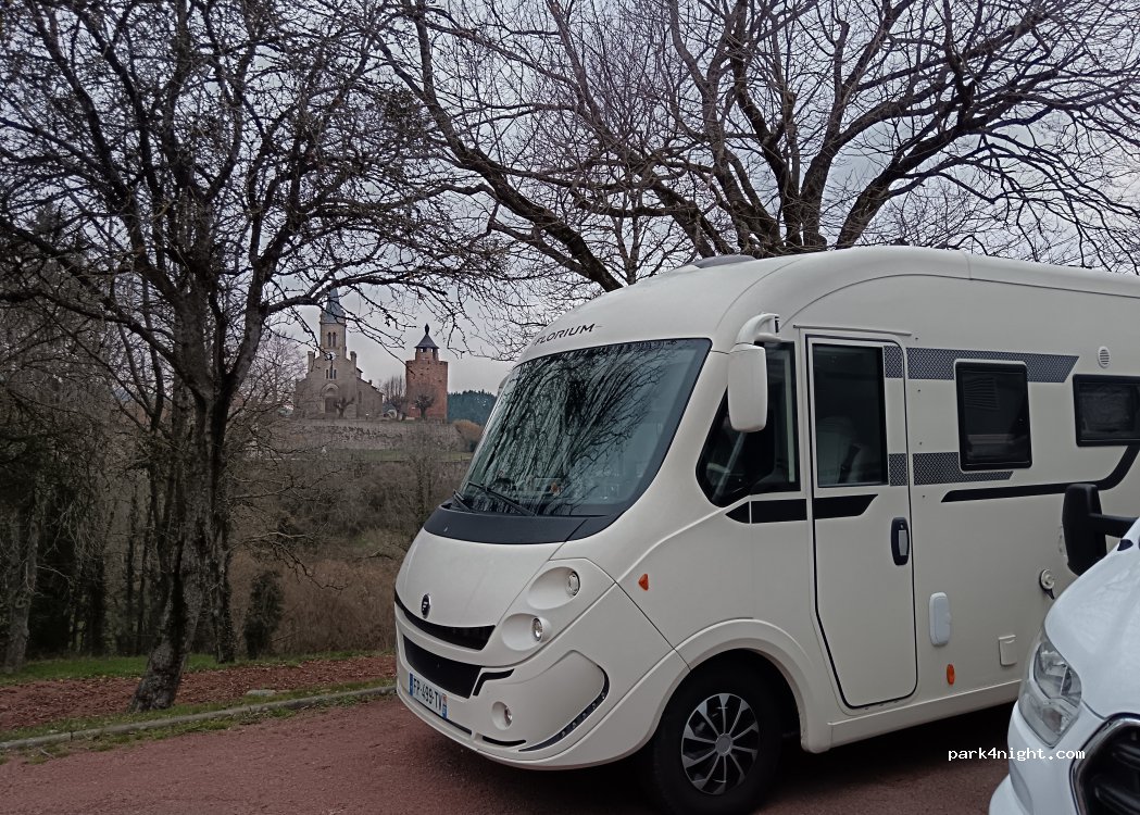 Great little parking area just a short walk from a pretty medieval village. Only two spaces and a couple of tight turns, so unsuitable for longer motorhomes (7m ). Best to reverse in. Service point available, but we didn't use it. Be sure to look around the village and climb the Keep for great views.