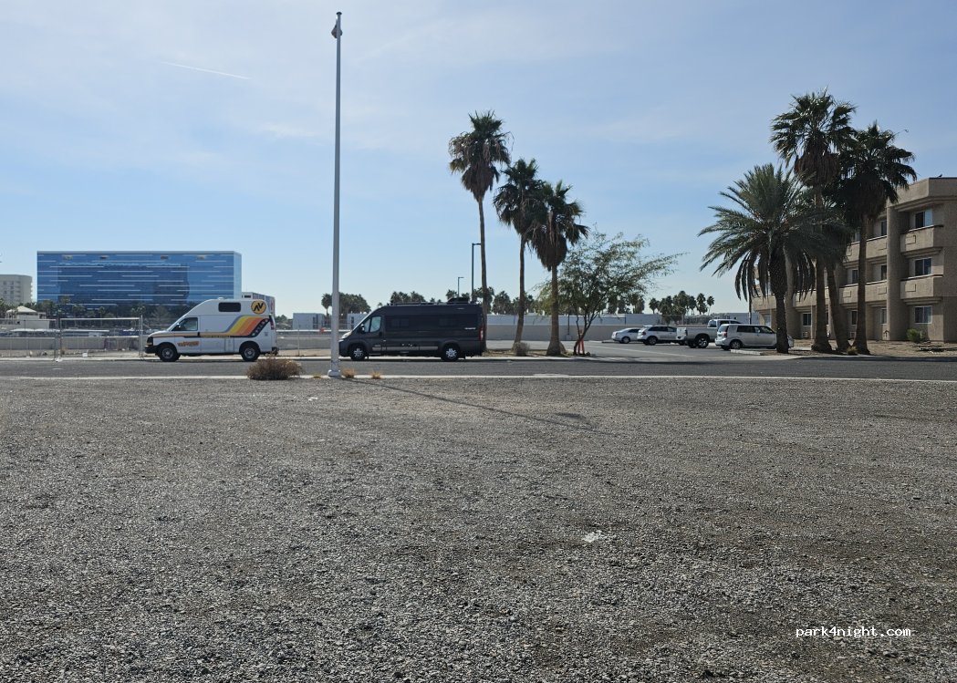 20 min walk from the Strip, street parking allowed. In fact, trucks parked there every weekend. A man confirmed that street parking was free (a rare gem in Vegas)