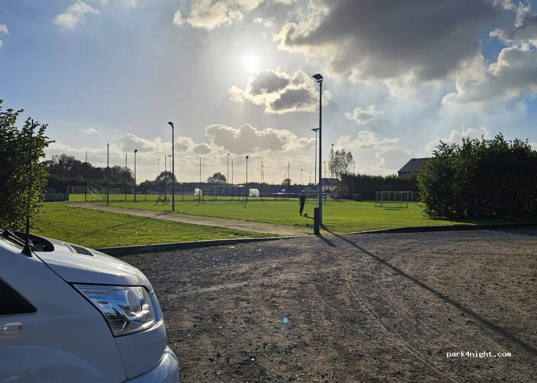 Parking naast sportveld. 's nachts rustig, overdag soms voetballers die komen trainen of spelen. Geen diensten. Zelfvoorzienend zijn dus. Geen verbodsborden.