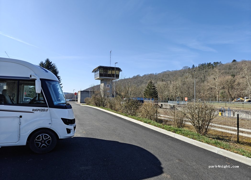 Parking pour une halte, pour les véhicules longueur 7 mètres maximum conseillée pour faciliter les manoeuvres. Grande écluse sur la Moselle, promenade à vélo possible. Camping interdit