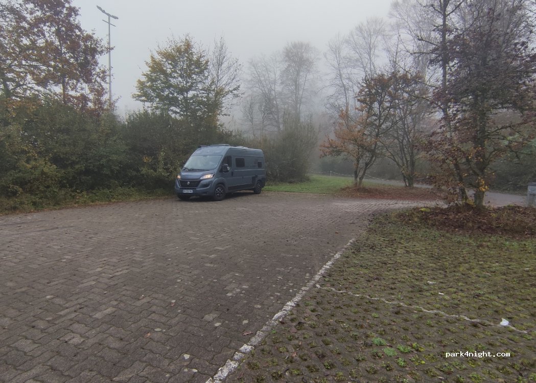Parking a l'arrière des tribunes du stade de foot. Petite route a proximité.