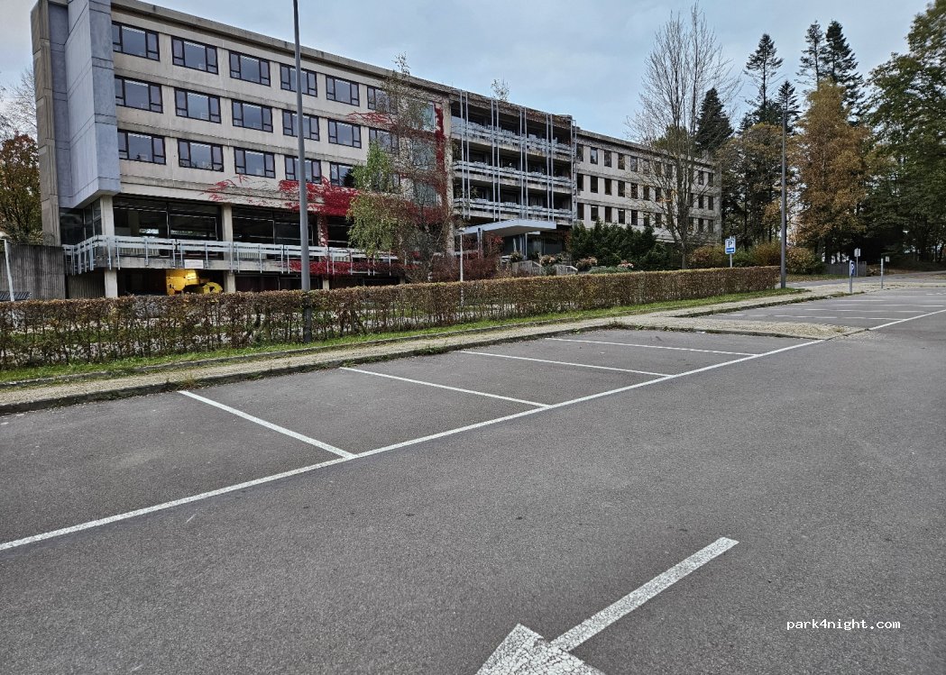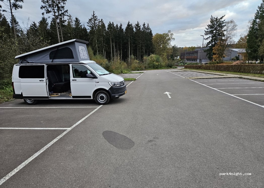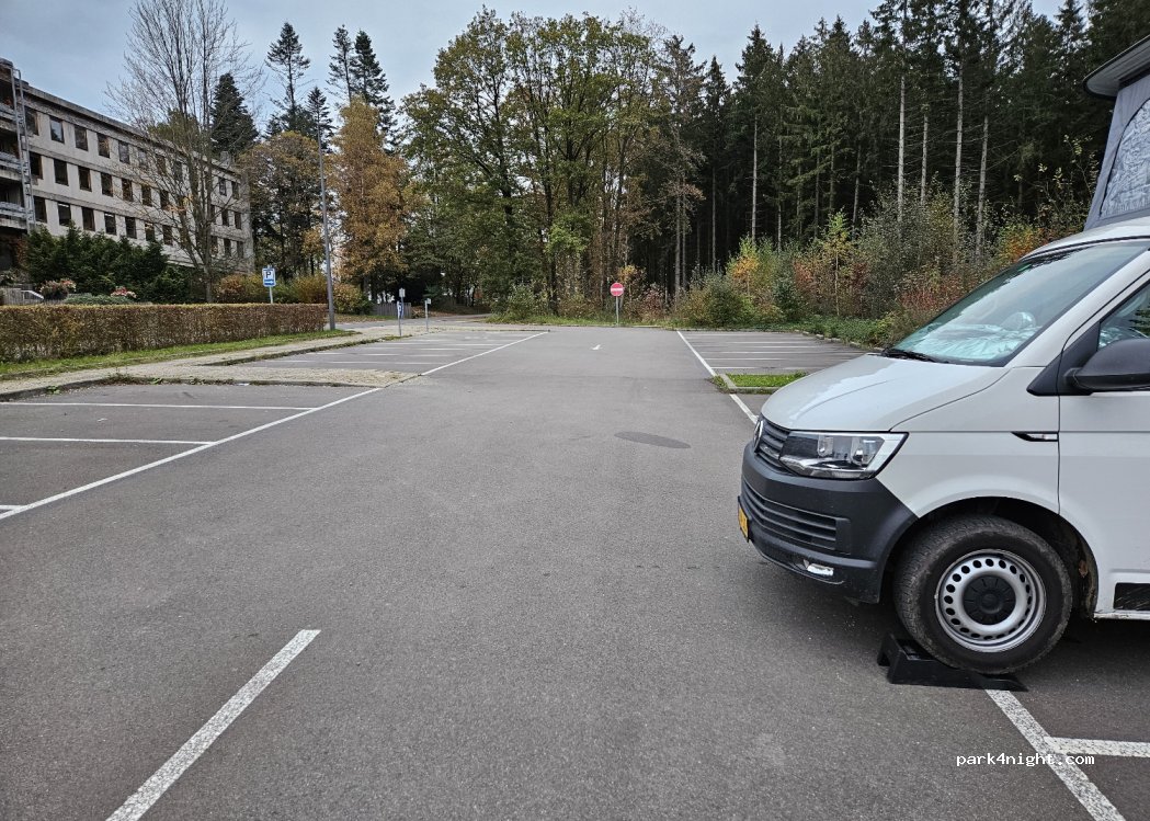 Un gran aparcamiento en una antigua escuela donde se hace referencia a los campistas. Se han colocado carteles que lo indican. El aparcamiento está asfaltado pero en pendiente, por lo que son necesarias rampas. Hay una farola pero eso es todo.