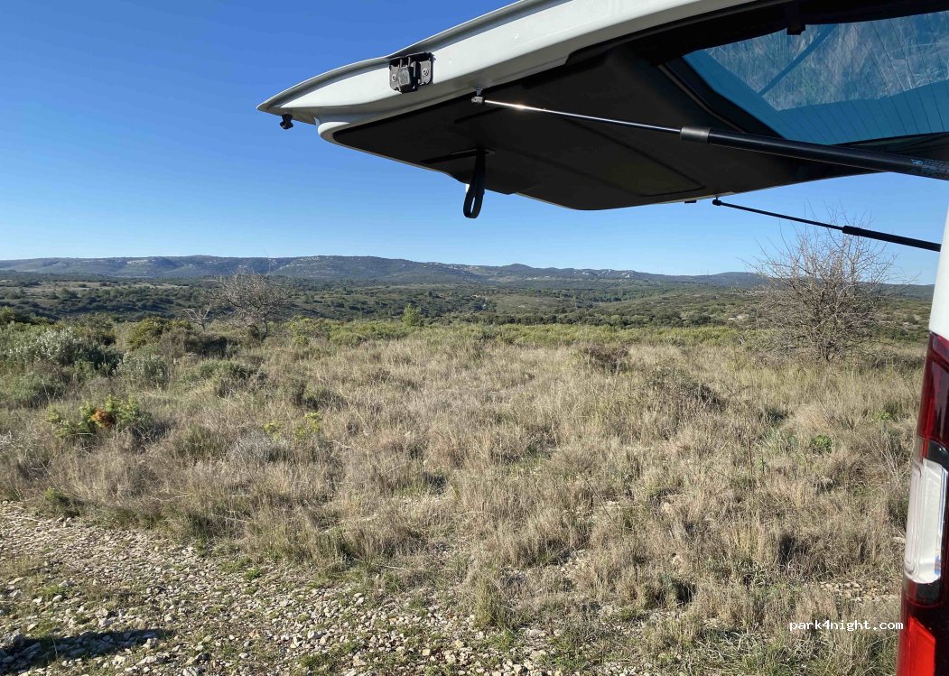 Tellement dommage que ce magnifique coin de Garrigue, soit envahi de déchets en tout genre : gravats, beuveries et pique-nique à la sauvage, etc. La vue est magnifique, le coin assez tranquille, et le spot le moins sale et celui à droite un peu en surplomb juste avant le panneau Privé. Je suis resté avec mon fourgon que pour la sieste.