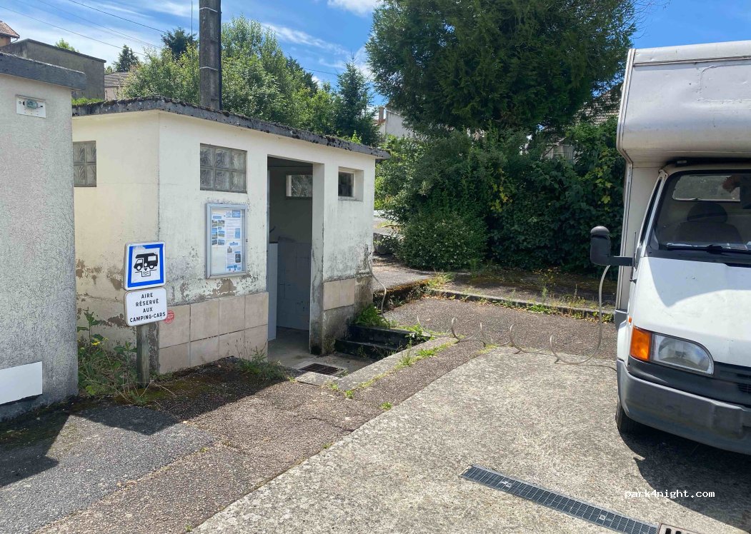 Nous avons passé une nuit sur cette aire, calme avec des toilettes et un accès à l'eau gratuit ainsi qu'une table de pique nique. Une boulangerie se trouve à 200m mais fermé le lundi.
