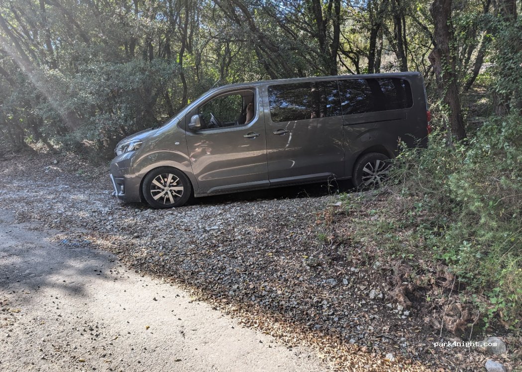 Place de stationnement légèrement en pente mais permettant de manger tranquillement à l'ombre via une route carrossable accessible en van.