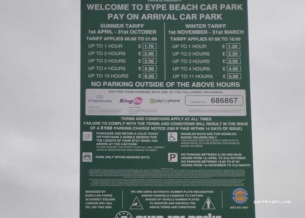 Just a heads up we went to Eype beach it's a very narrow road down to the beach there used to be a honestly box but now it's ANPR camera checked the board it said nothing about motorhomes etc so we bought a ticket. Had a very nice walk up the coastal path. as we were leaving we noticed a separate sign outside of the car park saying no CAMPER VANS so we are waiting to see what happens.
