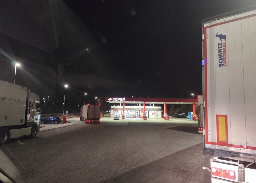 Estación cepsa, donde encontradas un bar restaurante y parada de muchos camiones, no sé cómo será de noche